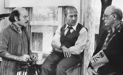 director Volker Schlöndorff, Dustin Hoffman & Arthur Miller on set