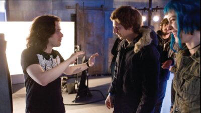 writer-director Edgar Wright, Michael Cera & Mary Elizabeth Winstead on set